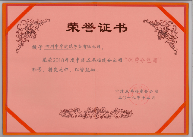 我公司于2018年(nián)12月(yuè)榮獲中建五局福建分(fēn)公司“優秀分(fēn)α包商”得(de)稱号